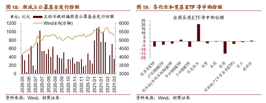 本周新成立偏股类公募基金358亿份,相比前期减半,其中包括不少行业类ETF(有色金属、医药、新能源ETF等)。