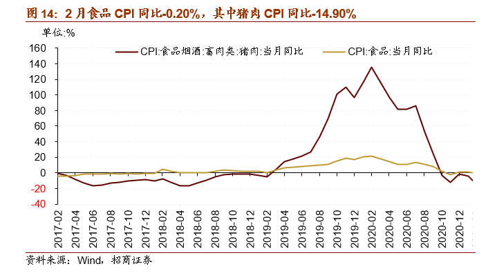 2月食品CPI同比转负,其中猪肉CPI降幅扩大。2月食品CPI同比-0.20%(前值1.6%),其中猪肉CPI同比-14.90%,相比上月的-3.9%,降幅进一步扩大11.0个百分点。