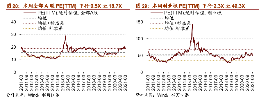 本周全部A股估值水平下行。截至3月12日收盘,全部A股PE(TTM)下行0.5X至18.7X,处于历史估值水平的80.1%分位数。创业板本周下行,PE(TTM)下行2.3X至49.3X,处于历史估值水平的52.5%分位数。代表大盘股的沪深300指数PE(TTM)下行0.3X至15.4X,处于历史估值水平的94.5%分位数。代表小盘股的中证1000指数PE(TTM)下行1.2X至27.7X,处于2014年以来历史估值的28.8%分位数。