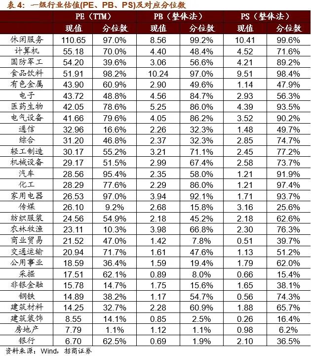 在行业估值方面,本周板块估值涨跌分化,其中,休闲服务板块上涨明显,涨幅超10.0X,机械设备、有色金属板块下跌明显,跌幅超1.0X。其中,休闲服务板块估值上涨11.7X至110.7X,处于97.0%历史分位;机械设备板块估值下跌1.3X至29.2X,处于51.5%历史分位;有色金属下跌1.2X至43.9X,处于60.9%历史分位。截至4月2日收盘,一级行业估值排名前五的行业分别是休闲服务、计算机、国防军工、食品饮料、有色金属。