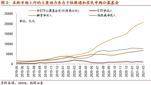 本轮市场上行的主要动力来自于陆股通和居民申购公募基金。