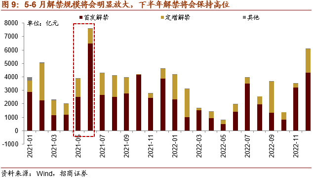 4月是全年解禁规模最小值,此后的5-6月合计解禁规模1.1万亿,解禁规模将会明显放大,下半年解禁将会保持高位,年内解禁规模3.7万亿。