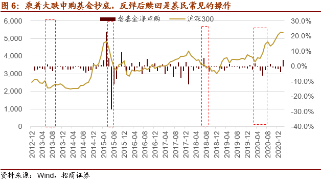 从老基金的申赎来看,有明显的趁大跌抄底,但无论是否反弹,都会选择赎回的特征。例如2013年5月,2015年7月,2018年7月,2020年3月,都是单月出现比较大的调整,老基金出现明显申购,但是随着市场反弹或者继续大跌,抄底资金会选择赎回,历史上,很难看到连续两个月的老基金净申购的情况。整体来看,市场还是存在明显的“短炒基金”的现象。由于2月老基金净申购,从历史规律来看,3月之后,随着市场反弹,老基金净赎回的概率加大。