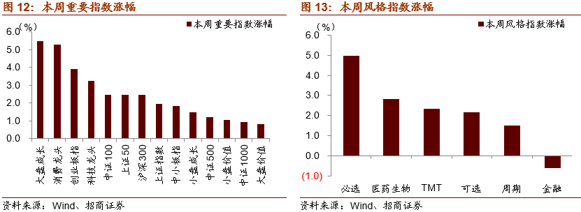 本周市场整体普涨,前期下跌幅度较大的板块反弹幅度较大,宽基指数全部上涨,大盘成长、消费龙头、创业板指、科技龙头指数上涨幅度均超过3%,大盘价值、中证1000、小盘价值指数涨幅相对落后,本周日均成交7000亿,较前几周有所缩量,南向资金本周净流入港股95.5亿,北向本周净流出A股99.4亿,从大类板块上来看,本周除了金融板块下跌外,其余各类风格本周均上涨,必选消费涨幅较大。
