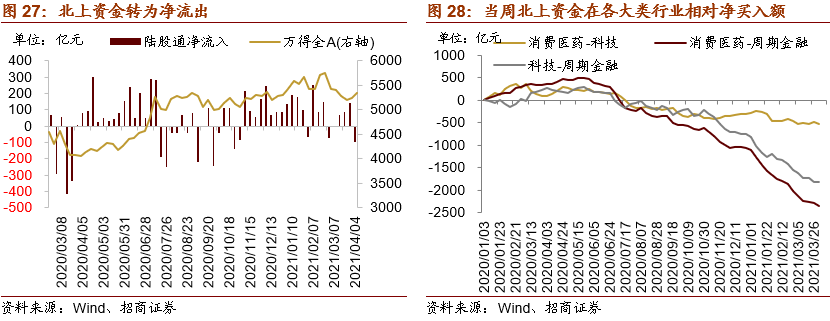 本周(3月29日~4月2日)北上资金从净流入转为净流出,净流出规模99亿元。行业偏好上,北上资金净买入规模较高的为银行、化工、非银金融等,分别净买入24.5亿元、11.5亿元、11亿元,其他净买入较多的包括建材、采掘、交运等;净卖出规模居前的包括医药、电气设备、汽车等。如果从大类行业来看,本周北上资金各大类板块的相对净买入额排序为周期金融>科技>消费医药。
