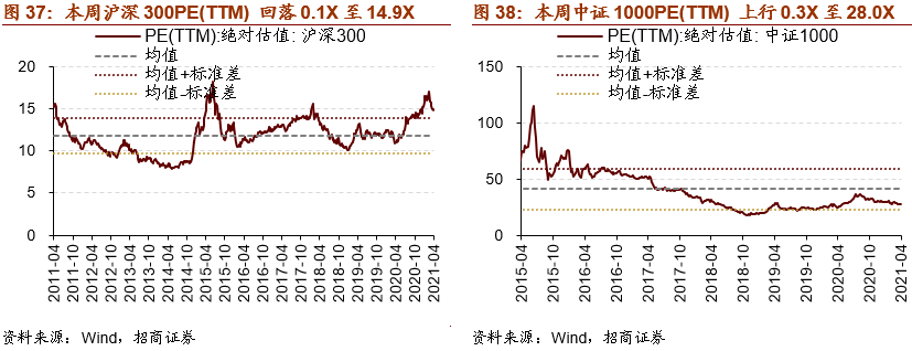 本周全部A股估值水平上行。截至4月2日收盘,全部A股PE(TTM)维持18.5X,处于历史估值水平的75.8%分位数。创业板本周上行,PE(TTM)上行1.0X至49.8X,处于历史估值水平的54.9%分位数。代表大盘股的沪深300指数PE(TTM)小幅回落0.1X至14.9X,处于历史估值水平的92.5%分位数。代表小盘股的中证1000指数PE(TTM)上行0.3X至28.0X,处于2014年以来历史估值的30.6%分位数。
