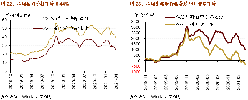 本周猪肉价格下行,养殖利润继续下降。截至4月2日,22省平均猪肉价格38.90元/千克,相比上周下降5.44%;仔猪平均价格为104.47元/千克,周环比下降3.53%;生猪平均价格24.99元/千克,周环比下降6.37%。在生猪养殖利润方面,本周自繁自养生猪养殖利润和外购仔猪养殖利润继续下降。截至4月2日,自繁自养生猪养殖利润为981.69元/头,较上周下降15.98%;外购仔猪养殖利润为-336.77元/头,较上周的-193.39元/头继续下降。