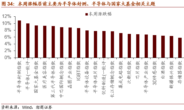 本周市场上涨,Wind全A指数周度上涨1.88%,创业板指涨3.89%,沪深300涨2.45%。本周涨幅居前的主要为半导体封测、半导体与国家大基金相关主题。