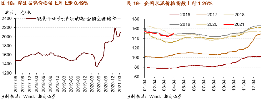 本周玻璃、水泥价格均上涨。价格方面,截至4月2日,全国主要城市浮法玻璃现货均价收于2116.09元/吨,较上周上行0.49%;在库存方面,截至4月2日,浮法玻璃生产线库存为3114万重量箱,较上周上行0.68%;白玻璃库存较上周上行1.31%至2872万重量箱;彩玻璃库存报163万重量箱,与上周持平。