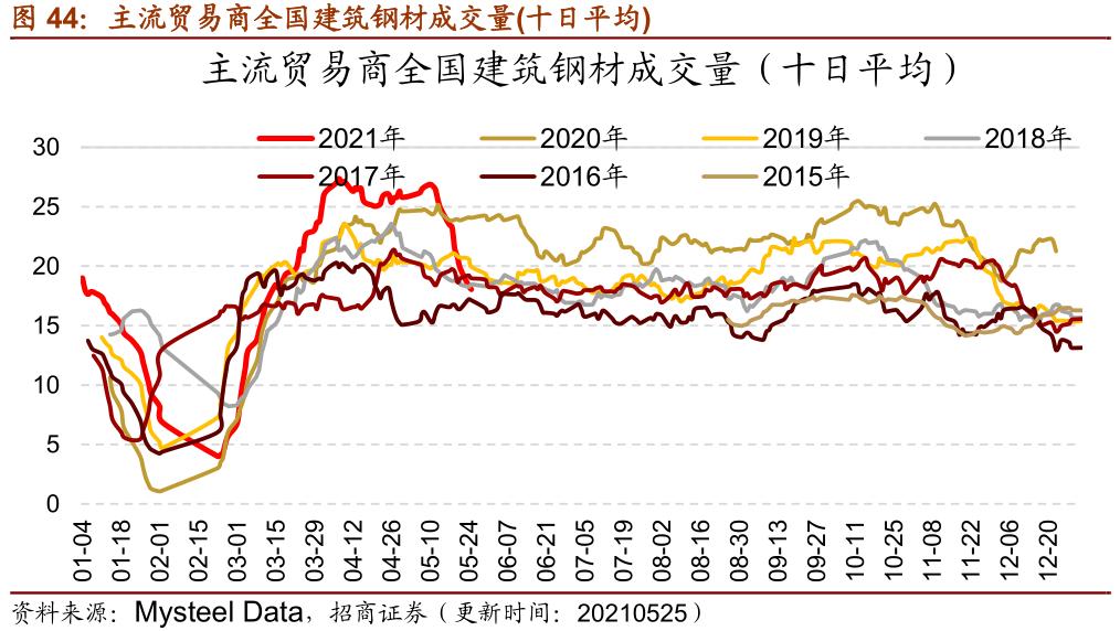 建筑钢材成交量十日均值周环比下行。根据Mysteel Data,5月25日主流贸易商全国建筑钢材成交量为18.04万吨;从过去十日移动均值情况来看,主流贸易商全国建筑钢材成交量十日均值为18.04万吨,周环比下行22.50%。