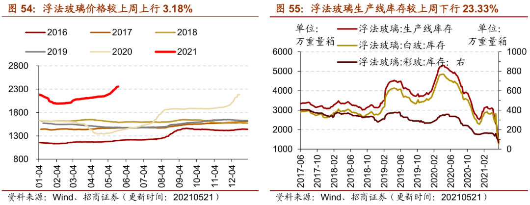 本周浮法玻璃现货均价上行,浮法玻璃生产线库存、白玻璃和彩玻璃库存均下行,浮法玻璃生产线开工率和产能利用率与上周持平。在价格方面,截至5月21日,全国主要城市浮法玻璃现货均价较上周上行3.18%至2358.45元/吨。库存方面,截至5月21日,浮法玻璃生产线库存较上周下行23.33%至1364万重量箱;白玻璃库存较上周下行22.58%至1265万重量箱;彩玻璃库存为66万重量箱,周环比下行34.00%。在生产端,截至5月21日,浮法玻璃生产线开工率64.58%,浮法玻璃产能利用率69.63%,均与上周持平。