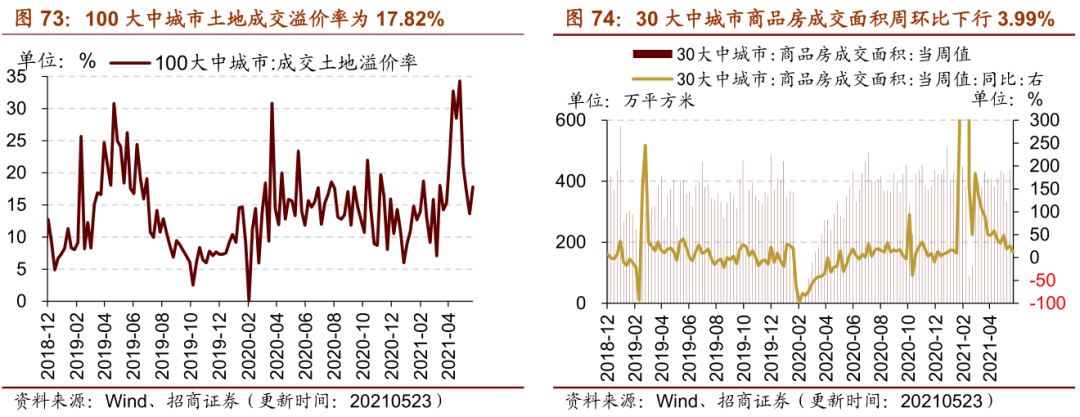 本周土地成交溢价率上行,商品房成交面积下行。截至5月23日,100大中城市土地成交溢价率为17.82%,较上周上行4.2个百分点;30大中城市商品房成交面积当周值为421.76万平方米,较上周下行3.99%。