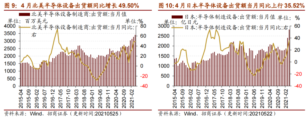 4月北美和日本半导体设备出货额同比增幅扩大。4月份北美半导体设备制造商出货额当月值为3409.5百万美元,同比上行49.50%,涨幅较上月扩大1.60个百分点;根据日本半导体制造装置协会统计数据,4月份日本半导体设备制造商出货额当月值为2820.54亿日元,同比上行35.52%,涨幅较上月扩大13.51个百分点。