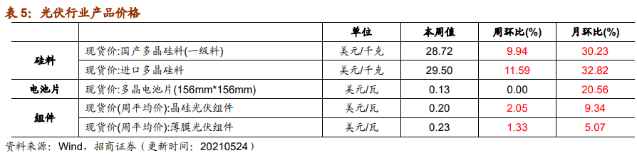 本周光伏产业链中硅料、组件价格上涨,电池片价格维持不变。在硅料方面,截至 5 月24 日,国产多晶硅料价格为 28.72 美元/千克,较上周上涨 9.94%;进口多晶硅料价格为 29.50 美元/千克,较上周上涨 11.59%。在电池片方面,截至 5 月 24 日,156 多晶电池片现货价维持在 0.13 美元/瓦。在组件方面,截至 5 月 19 日,晶硅光伏组件现货价周环比上涨 2.05%,价格上涨至约 0.20 美元/瓦;薄膜光伏组件现货价周环比上涨1.33%至约 0.23 美元/瓦。