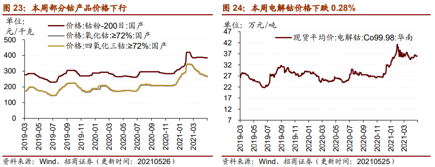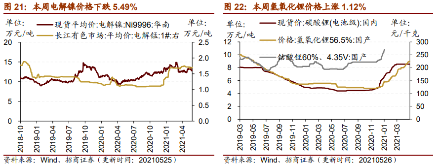 本周电解镍、电解钴价格下行,六氟磷酸锂、电解锰、氢氧化锂等价格上行,氧化钴、四氧化三钴等钴产品价格持续下行。在电解液方面,截至 5 月 25 日,六氟磷酸锂价格较上周涨 3.77%至 27.5 元/吨。在正极材料方面,截至 5 月 25 日,电解镍现货均价较上周跌 5.49%至 129000 元/吨;截至 5 月 26 日,电解锰市场平均价格较上周涨 0.89%至 17050 元/吨。在锂原材料方面,截至 5 月 25 日,电池级碳酸锂现货价格维持在85500 元/吨;截至 5 月 26 日,氢氧化锂价格较上周涨 1.12%至 90000 元/吨;三元材料价格维持在 147 元/千克;截至 5 月 25 日,电解液锰酸锂价格维持在 3.70 万元/吨;电解液磷酸铁锂价格维持在 6.45 万元/吨。钴产品中,截至 5 月 25 日,电解钴价格较上周跌 0.28%至 360000 元/吨;截至 5 月 26 日,钴粉价格较上周跌 0.78%至 383 元/千克;氧化钴价格周跌 1.12%至 265 元/千克;四氧化三钴价格周跌 1.11%至 268 元/千克。