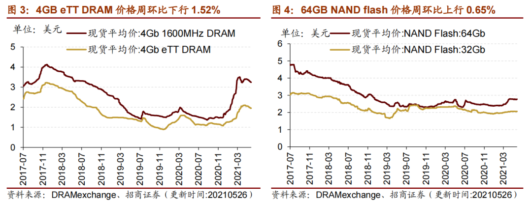 本周64GB NAND flash和32GB NAND flash价格上行,4GB eTT DRAM和 4GB 1600MHz DRAM 价格继续下行。截至5月25日,4GB 1600MHz DRAM价格周环比下行1.07%至3.244美元,4GB eTT DRAM价格周环比下行1.52%至1.95美元。32GB NAND flash价格周环比上行0.24%至2.058美元,64GB NAND flash价格周环比上行0.65%至2.774美元。