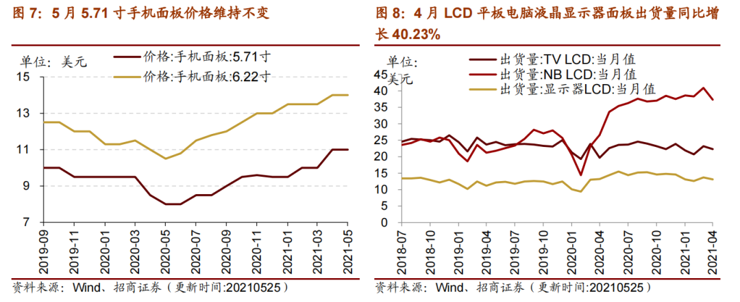 5月份大部分液晶面板价格继续上行,手机面板价格维持不变。液晶电视面板方面,截至5月25日,32寸液晶电视面板价格为88美元/片,月环比上涨3.53%;43寸液晶电视面板价格为137美元/片,月环比上涨3.01%;55寸液晶电视面板价格为223美元/片,月环比上涨3.24%;液晶显示器中,截至5月25日,21.5寸液晶显示器价格为67.3美元,月环比上涨6.32%;7寸平板电脑面板价格为20.5美元,月环比上涨2.50%;截至5月20日,27寸显示器价格为92.7美元,月环比上涨3.34%;手机面板方面,5月份5.71寸手机面板价格维持在11美元;6.22寸手机面板价格维持在14美元。