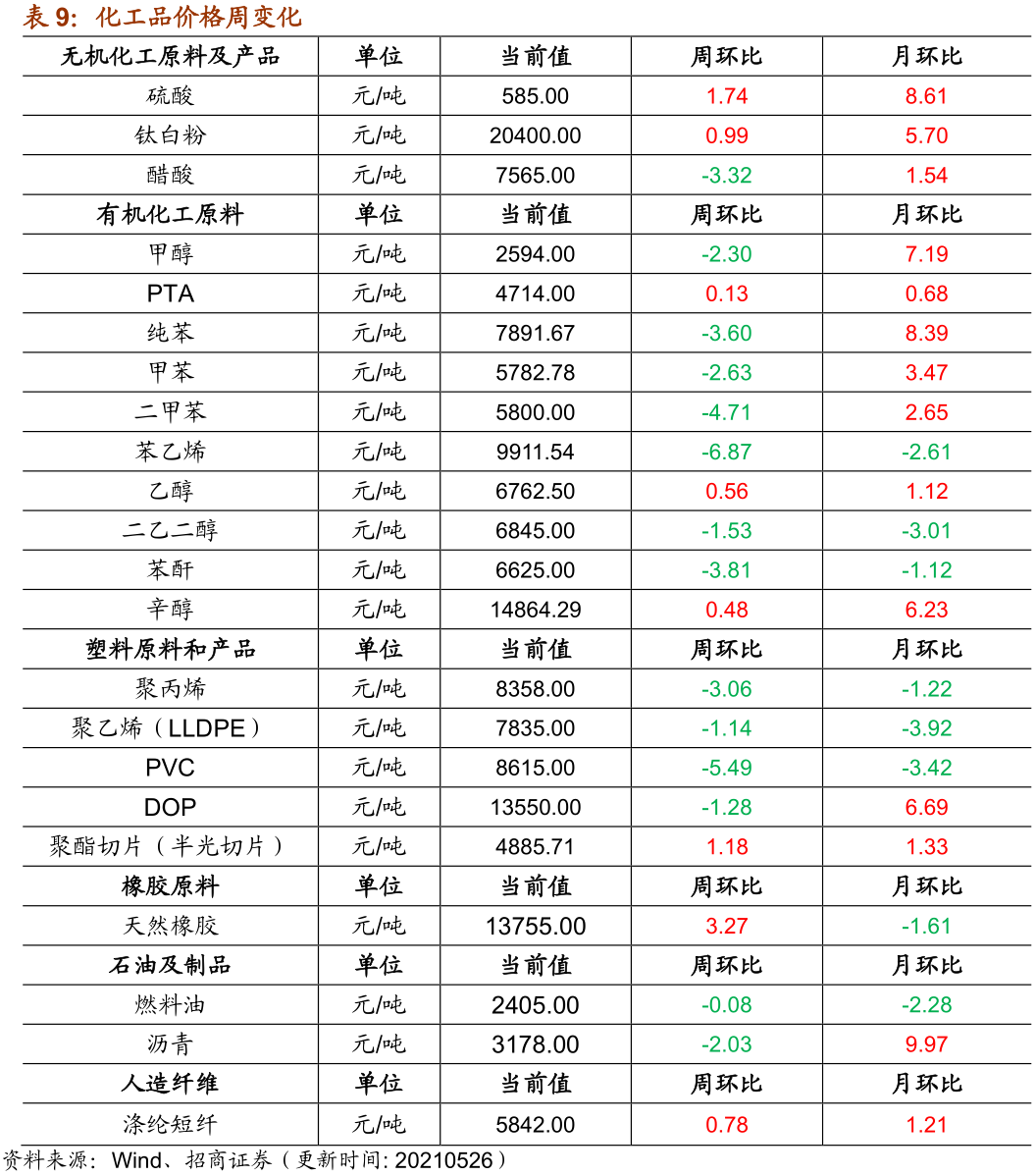 无机化工品中硫酸价格继续上行,醋酸价格连续下行。截至5月20日,硫酸市场均价585.0元/吨,较上周上行1.74%。截至5月23日,醋酸市场均价7565.0元/吨,较上周下行3.32%。截至5月25日,钛白粉市场均价20400.0元/吨,较上周上行0.99%。截至5月26日,纯碱期货结算价较上周上行7.25%至1938.0元/吨。