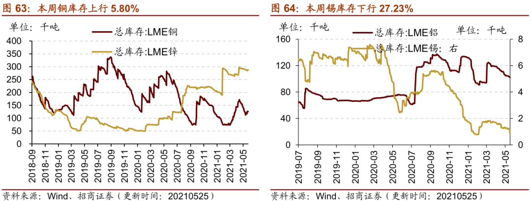 有色金属价格普遍下行,铝、镍等价格跌幅比较大;有色金属库存多数下行,锡库存跌幅较大。截至5月26日,铝价格周环比下行5.79%至18400.0元/吨;镍价格周环比下行4.23%至128050.0元/吨;铜平均价收于71930.0元/吨,周环比下行3.97%;长江有色市场锌价格为23050.0元/吨,周环比下行1.91%;铅价格周环比下行1.91%至15400.0元/吨;锡价格周环比下行0.62%至198750.0元/吨;长江有色市场钴价格352000.0元/吨,周环比下行0.28%。库存方面,截至5月25日,铜库存较上周上行5.80%至125925.0吨;锌库存上行0.47%至287725.0吨;锡库存周环比下行27.23%至855.0吨;铅库存本周下行2.04%至102000.0吨;铝库存较上周下行1.80%至1733775.0吨;镍库存249372.0吨,较上周下行1.58%。