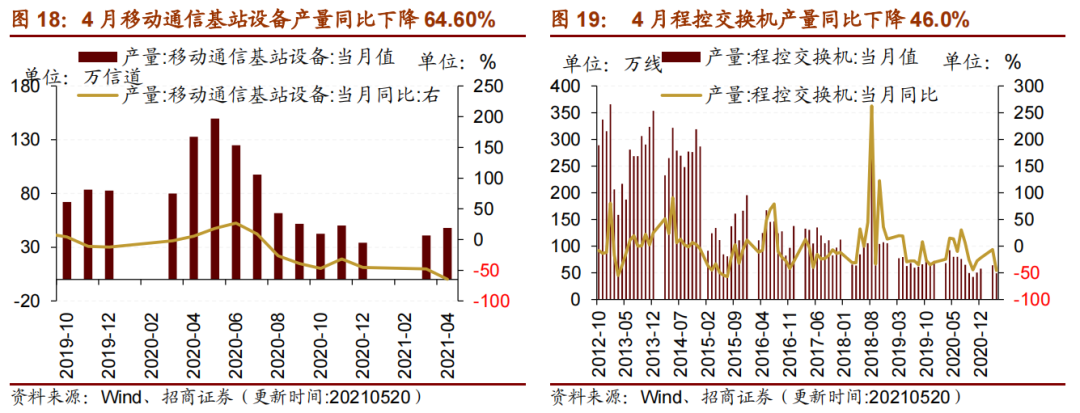 4月份移动通信基站产量同比降幅扩大。4月份我国移动通信基站产量当月值为47.90万信道,同比下降64.60%,降幅较上月扩大16.8个百分点。1-4月份我国移动通信基站累计产量为155.3万信道,累计同比下降45.60%,较1-3月份累计同比降幅扩大17.20个百分点。近日台股电子公布4月营收情况,IC设计、IC制造、储存器、封装、PCB、被动元件、面板、LED等厂商营收均同比上行,硅片和部分镜头同比下行。IC设计领域联发科4月份营收当月同比增长78.00%,增幅较3月增幅扩大2.11个百分点;联咏4月份营收当月同比增长69.37%,增幅较3月份扩大5.41个百分点;IC制造领域台积电、联电、世界、稳懋3月份营收当月同比分别增长15.95%、8.78%、22.65%和0.52%,其中台积电增幅扩大2.20个百分点,联电增幅缩小5.28个百分点,世界增幅缩小1.92个百分点,稳懋同比转正;存储器厂商南科营收同比涨幅扩大11.94个百分点至31.58%,华邦电同比涨幅缩小1.43个百分点至90.98%,旺宏营收同比转正至11.15%;硅片厂商台胜科当月营收同比降幅扩大3.16个百分点至-6.11%,封装厂商日月光当月营收同比上涨17.08%,增幅较3月扩大6.21个百分点;PCB厂商景硕电子营收同比增长32.55%;被动元件厂商国巨4月份营收当月同比增长103.06%,奇力新4月份营收当月同比增长3.22%;镜头厂商大立光营收同比下跌27.00%,玉晶光当月营收同比下跌28.31%,亚洲光学营收同比上涨39.64%;面板、LED厂商中,晶电营收同比增幅扩大,友达、群创、亿光营收同比增幅收窄。