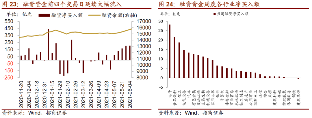 5月中下旬以来,股票市场流动性改善的驱动作用下,A股市场明显反弹,其中北上资金和融资资金是重要增量资金。北上资金近两周合计净流入557亿元;两融资金从5月初转正后基本持续流入,最近两周融资净流入规模均超过200亿元,融资余额创下2015年7月以来的新高。另一方面,公募基金发行在最近两周也有所回暖。