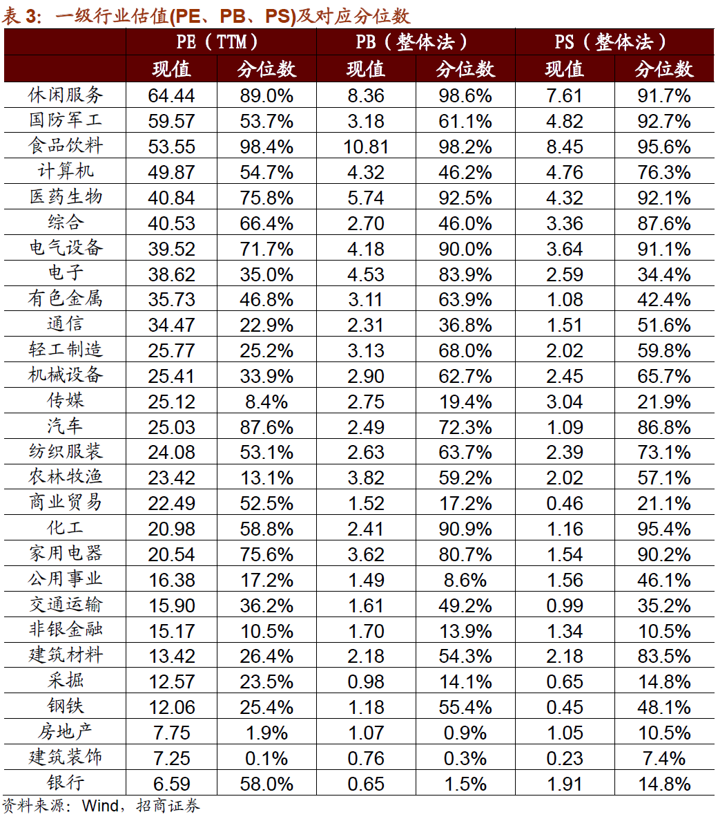 在行业估值方面,本周板块估值涨跌分化,其中,食品饮料估值上涨较多,涨幅达到0.9X,休闲服务板块下跌较多,跌幅超过4.0X。其中,食品饮料板块估值上涨0.9X至53.6X,处于98.4%历史分位;综合板块估值上涨0.9X至40.5X,处于66.4%历史分位;休闲服务板块估值下跌4.6X至64.4X,位于历史89.0%分位数。截至6月4日收盘,一级行业估值排名前五的行业分别是休闲服务、国防军工、食品饮料、计算机、医药生物。