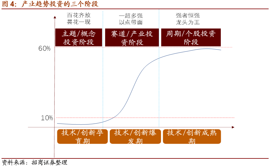 要有一个长期发展前景,大概率的原因来自于技术创新、模式创新和产品创新。而任何一种创新,基本都遵循了“S曲线”,在技术、模式、产品创新之初,由于技术不成熟,模式不被理解接受,产品创新有待完善,渗透率会在10%以下波动。这个阶段可以被称为“创新孕育期”,这个阶段属于“主题概念投资阶段”,由于渗透率较低,几乎很难有业绩爆发,因此这个阶段的投资呈现百花齐放。