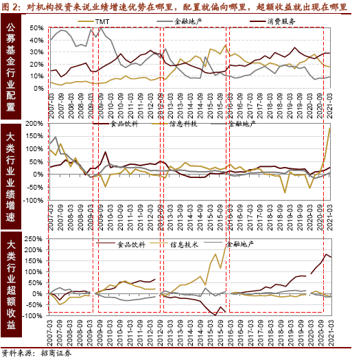 中期视角,A股的投资者最喜欢什么——“业绩增速、业绩增速还是业绩增速”, 从过去的历史经验来看,盈利增速是机构投资者最看重的投资要素。从大类行业的配置来看,几乎是哪个大类行业有业绩优势,投资者就会倾向于去配置那个行业。使得该行业出现较为明显的超额收益。这种投资方式也非常符合客观实际情况,上市公司的股价短期来看是估值波动造成的,但是拉长来看最终是来自于盈利的增长,我们当然倾向于买入增速高,成长性好的标的,因此,业绩的相对优势在哪里,配置就偏向哪里,超额收益就出现在哪里。