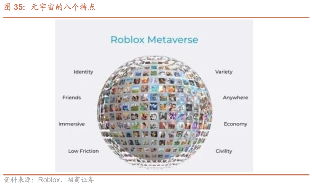 Roblox总结的元宇宙8个特点:身份、朋友、沉浸感、低延迟、多元化、随地、经济系统和文明。根据Roblox的CEO Baszucki,真正的元宇宙有8个不同的特点。你需要有一个虚拟身份的形象,可以是摇滚明星和时尚模特,这是元宇宙的一大卖点。你可以和真人交朋友,并且在元宇宙里社交。这必须是“具有沉浸感”的,或者让你觉得处于其他地方并且失去了对现实的感知。元宇宙必须是低延迟的,意味着你可以随时到任何地方。如果你在学校研究古罗马历史,就可以一秒内传送到那里,并且与你的同学一起开启古罗马之旅。它必须有大量差异化的内容支持人们长期的兴趣,你需要一个出色的经济系统确保人们可以在元宇宙里生活,并不只是程序员,还包括美术师和游戏策划们。最终,你需要安全和稳定性,这样人们才可以聚到一起,改善数字文明。