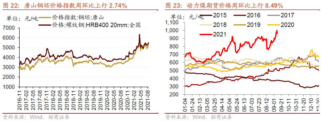 焦炭、焦煤、动力煤期货价格周环比均上涨。截至9月10日,焦炭期货价格周环比上行9.81%至3666.0元/吨;焦煤价格周环比上行12.76%至2951.0元/吨;动力煤期货价格周环比上行8.49%%至966.2元/吨。
