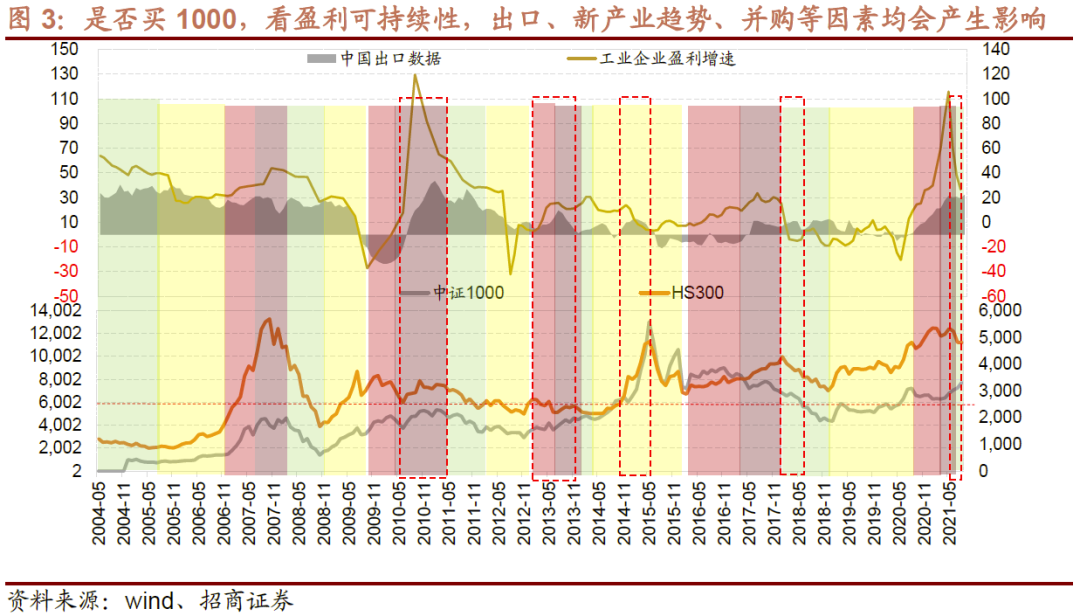 弃300后是否买1000呢?取决于企业盈利的持续性、是否有新产业趋势,而社融下行后,企业盈利的可持续性很大程度上决定于出口。如果有新产业趋势、出口相对稳定,则1000的企业盈利趋势稳定,则大家买1000,类似包括2010/2013/2015年上半年,2015年和2018年6月之后,出口增速均大幅下滑,企业盈利加速下滑到一定水平,1000也会开启暴跌。今年有“双碳”带来的新能源和高能耗限产的产业趋势,叠加外需增速高,所以投资者也是持续买1000。