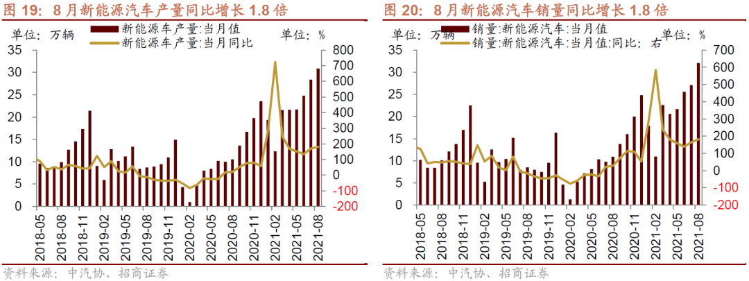 8月国内新能源汽车产销继续刷新历史记录,并且市场渗透率已经提升至17.8%。8月我国新能源汽车当月产销量分别完成30.9万辆和32.1万辆,,首次超过30万辆,同比均增长1.8倍。2021年1-8月,新能源汽车产销分别达到181.3万辆和179.9万辆,同比增长均为1.9倍,累计渗透率接近11%。