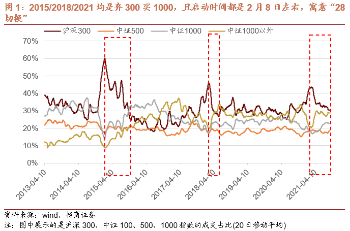 为何会出现这种弃300买1000的风格转换,是否弃300核心的变量在于“新增社融增速”,社融背后就是基建房地产投资,当社融增速触顶回落,转为负增长的阶段,投资者对经济的预期转为悲观,而沪深300的主要成分板块,金融、可选消费、周期大白马的业绩趋势都或多或少都与基建和房地产相关,因此,市场预期这些板块业绩趋势回落。做出的决策是,至少不买300。不只是2015年和2018年,2013年、2010年也出现过类似的情况,基本符合信贷周期的三年半左右的规律。所以,A股有一句老话,“社融稳、白马升;社融兴,搞核心”。