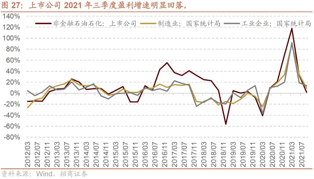 从上市公司盈利角度来看,在经历了2020年疫情冲击之后,此后稳增长发力和全球经济复苏,企业盈利增速持续攀升,今年一季度之后,随着基数明显抬升,且今年以来稳增长力度逐渐减弱,房地产调控力度加大且疫情始终反复影响经济,二季度开始上市公司盈利增速明显下滑,工业企业三个月滚动盈利增速下行至16%附近。而受到大宗商品价格维持高位影响,上市公司成本率基本都不同程度攀升,毛利率下降,剔除金融石油石化后,三季度A股上市公司单季度增速下降至1.8%。