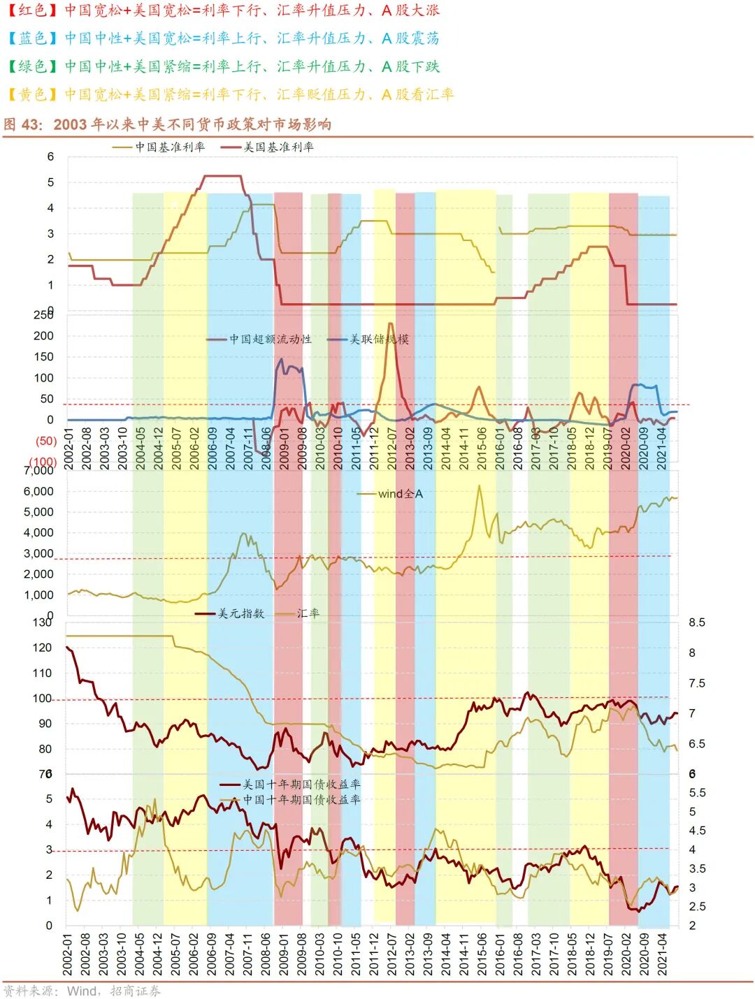 美国货币政策也可以分为数量型工具和价格型工具,美国数量型工具在2008年开始体现为美联储购买国债或者MBS等证券,被称为“QE”;价格型工具就是经典的联邦基金利率。QE和降息被认为是美联储宽松,缩减QE为政策边际收缩,加息和缩表可以看成是美联储货币政策紧缩。于是,我们可以将2003年以来划分为四种颜色。