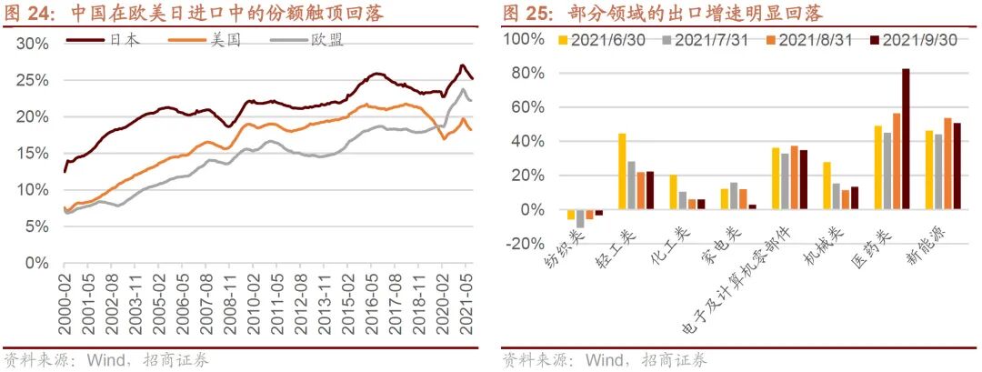 但是随着新冠特效药逐渐出炉,全球疫苗接种的比例进一步提升,疫情得到解决的概率在明显提升,全球的生产处在持续回升的过程之中,中国的份额优势会相对削弱。而根据前面的分析,全球的需求可能会迎来边际的向下拐点,因此支撑中国出口的总量因素和结构因素都将有所削弱,未来中国的出口增速将会在高基数的态势下呈现持续回落的特征。