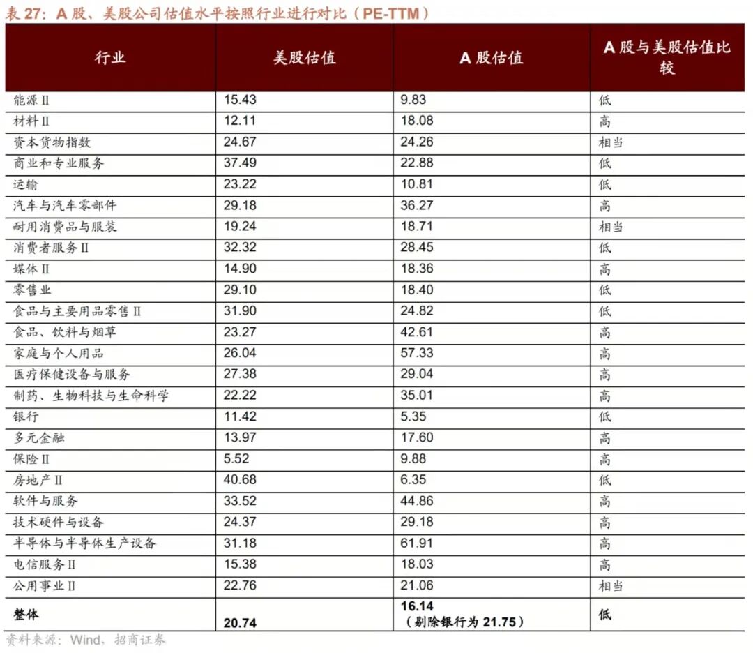 A股估值明显低于美股的行业依次为房地产、商业和专业服务、运输、零售业、食品与主要用品零售、银行、能源,主要是以传统行业为主。