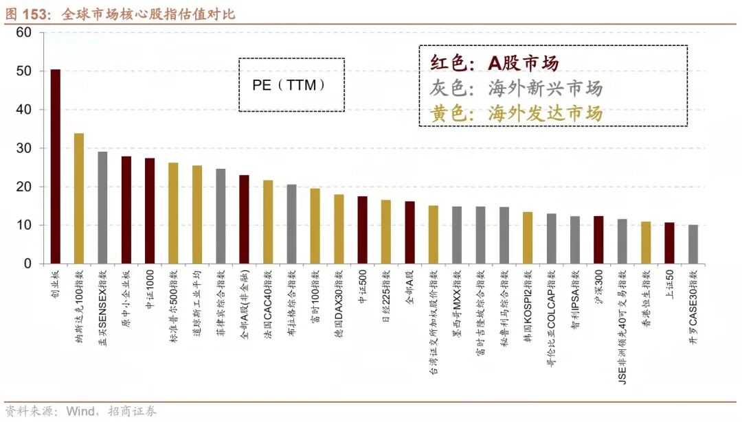 与全球股票市场核心指数估值对比,由于估值较低的金融板块占比较高,因此整体A股估值处于中等略偏低的水平,沪深300和上证50估值相对更低;剔除金融后A股估值处于中等略偏高的位置,创业板指、中证1000、中小板指估值相对更高。