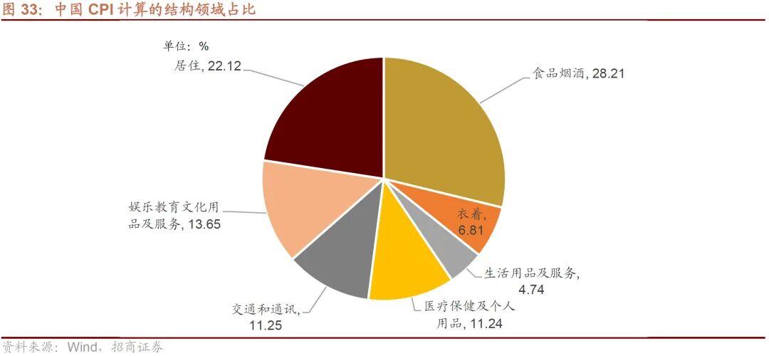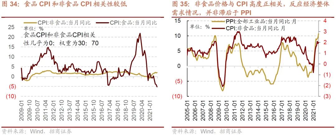 CPI的结构中食品类占比约为30%,非食品类的占比约为70%,在实际的贡献测算过程当中,最新数据显示食品CPI对CPI的贡献约为20%左右,非食品CPI贡献约为75%左右,因此对于CPI贡献更大的仍然是非食品CPI,而从图中可以看出非食品CPI与PPI基本同步反映了经济总体需求的情况,而非滞后于PPI,因此若明年在高基数的背景之下,大宗商品价格回落拉动PPI增速回落则非食品CPI增速难以进一步回升,甚至可能会保持回落的趋势。