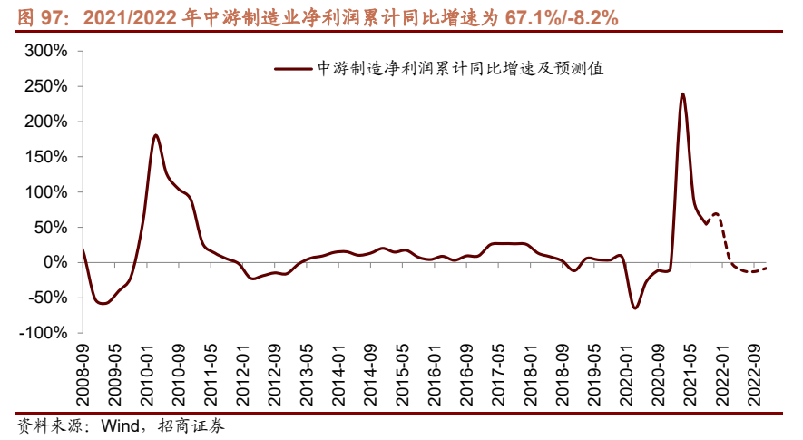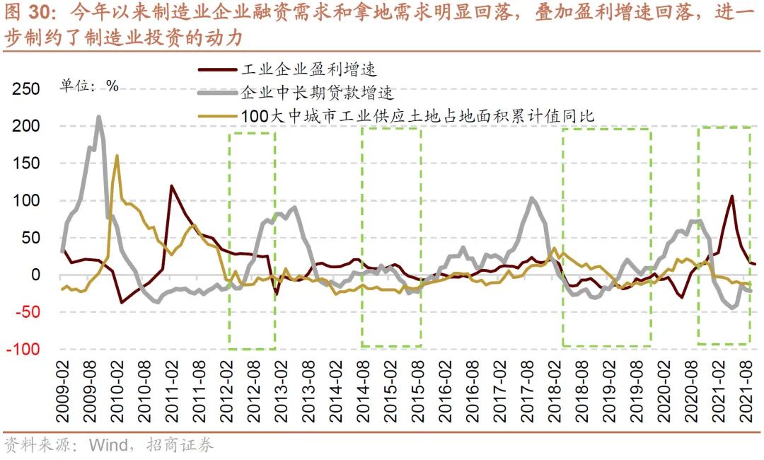 去年疫情爆发以来,随着传统行业投资回暖,防疫物资和居家消费品出口企业投资意愿的回升,以及以新能源、半导体、医疗设备等相关的新兴企业投资需求旺盛,去年的整体制造业投资需求非常旺盛。而今年以来随着“两高”行业投资限制进一步趋严,居家消费品和防疫物资的出口增速回落,新产业的产能仍在释放的过程中,制造业企业整体的融资需求和拿地需求均明显回落。当前工业企业盈利增速处在回落的趋势之中,进一步制约了制造业投资的动力,在社融增速企稳之前,预计制造业融资和投资需求仍保持相对稳定。