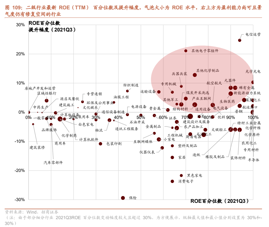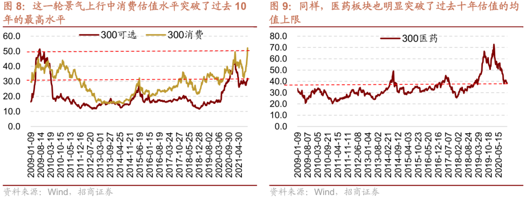 由于机构投资者更希望追求长期价值。因此,对于长期空间大,成长性强的行业和赛道,一旦行业景气度出边好转迹象,投资者通常会给未来的成长性以更高的溢价,这也是为什么2019年以来局部块涨幅非常大关键原因之一。因此在这一轮景气上行中消费、医药、新能源的估值水平均突破了过去10年的最高水平。当然反过来在景气回落的时候,由于估值的波动比较大,也会出现非常明显的回撤。