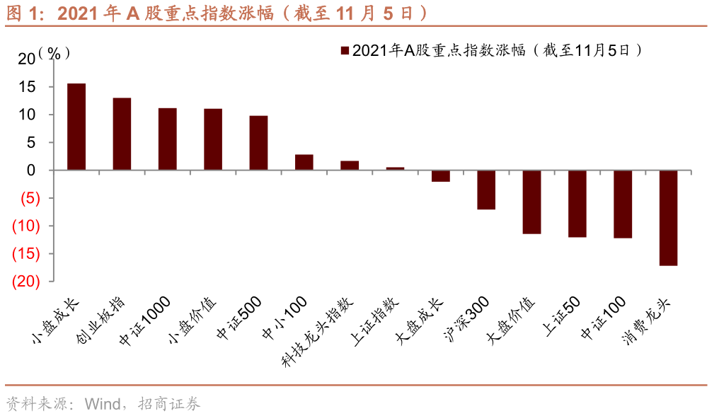 2021年A股市场整体波动加大,结构性分化加剧,截至11月5日,A股主要指数中,上证指数呈现宽幅震荡走势,小盘成长、创业板指、中证1000、中证500等指数呈现震荡上行走势,涨幅均超过10%,大盘成长、上证50、中证100、消费龙头等指数呈现震荡下行走势,跌幅均超过10%。整体而言,2021年A股市场风格分化特征明显,中小盘指数显著跑赢,主要驱动在于新能源、上游资源品板块个股上涨贯穿全年,景气分化是造成风格分化的核心因素。