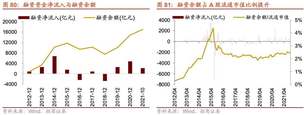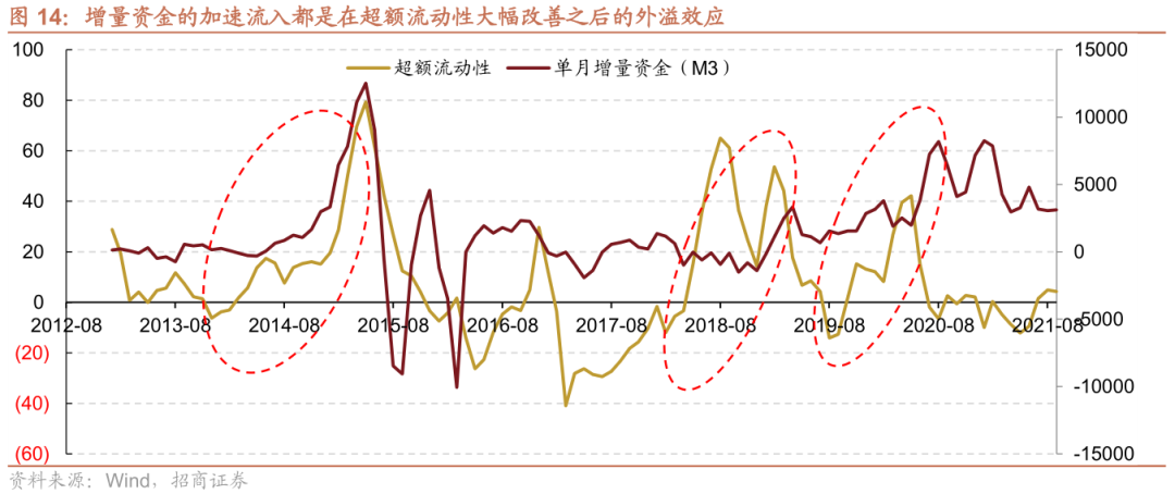 我们定义超额流动性——银行间超储规模的同比变化来衡量广义的金融系统的流动性,当超额流动性转正大幅提升后,金融体系的流动性增加,金融体系的流动性随后产生外溢效应,则我们会看到增量资金流入股票市场。而本轮增量资金的大幅流入,始于2018年下半年开始的货币环境宽松,2019~2020年上半年流动性仍然保持宽松,连续两年的宽松流动性环境最终助推2019年初至2021年上半年大规模的增量资金流入A股,也带来前面所描述喧嚣的A股。