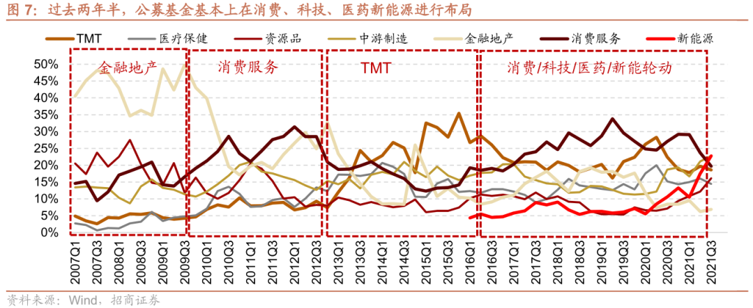 居民资金通过公募基金入市也使得基金重仓和加仓的方向出现了大涨。过去两年半,公募基金基本上在消费、科技、医药和新能源进行布局,由于规模不断增加,公私募调仓对市场行情的影响越来越大,而且在增量资金的强化效应下,消费、科技、医药和新能源也呈现此起彼伏的大型投资机会。