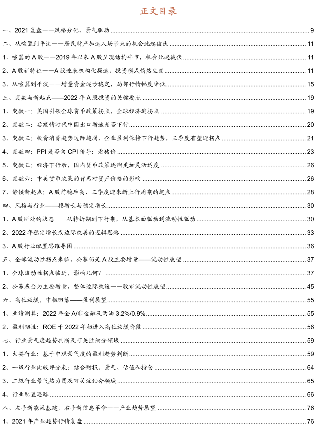 经历了大型机会此起彼伏的过去三年之后,进入到2022年,我们认为随着增量资金趋于平稳。经济整体景气度有所下行,局部板块行情的幅度将会逐渐降低,体现为从喧嚣到平淡的特征。
