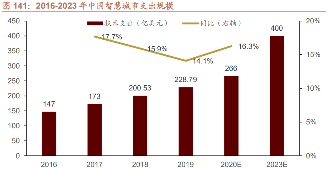 智慧城市是指运用物联网、云计算、大数据、空间地理信息集成等新一代信息技术,促进城市规划、建设、管理和服务智慧化的新理念和新模式,旨在推动城市新型管理和智慧化服务。在5G等新型基础设施建设背景下,我国智慧城市规模将逐步扩大,前瞻产业研究院预测智慧城市规模将于2023年达到400亿美元。根据IDC数据,我国智慧城市投资主要集中在智慧电网、视频监控、智慧交通三个领域。据IDC研究显示,在2018-2023年,中国市场支出金额占比前三的应用场景依次为智能电网、固定智能视频监控以及智慧交通系统。2019年,三个应用场景的投资规模约占支出总额的43%,预计到2023年比例将下降至37%。随着智慧城市相关技术的发展,应用场景将呈现多样化趋势,在2018-2023年内增长最快的应用场景依次为数字孪生、V2X(车联网)技术以及开放数据。