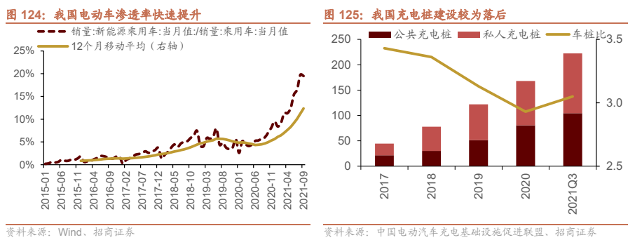 电动车进入爆发期,充电桩建设明显落后。今年以来,我国新能源车的渗透率不断提升,从去年底的约5%提升至截止今年9月约12%。与此同时,欧洲电动车的渗透率也提升较快,美国有望在政策推动下接力。尽管电动车保有量的不断增长,充电桩的建设却较为缓慢,截止2020年底,我国车桩比仅为3:1。