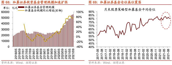 2019年以来,居民通过公募和私募加速入市,截止2019年9月,股票型和混合型公募规模达到超过8万亿,较2018年12月底增加267%,这其中有净值上涨的贡献,但是从份额增长情况来看,股票型和混合型公募的份额从2018年年底的2.1万亿份增长至2021年9月底的5.3万亿份,居民资金的流入是规模增长的主要原因。而私募基金的规模从2018年底的1.9万亿元增长至2021年9月的5.6万亿元,增幅达到191%。