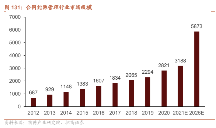 节能高效是新能源基建投资的第三个重点领域。节能增效的主要解决方案是合同能源管理,我们可以用合同能源行业的产值规模预测工业、交通、建筑等终端领域的节能增效投资。根据前瞻研究院的预测,合同能源管理行业2020年的产值规模约为2821亿元,至2025年将增长至5000亿元。