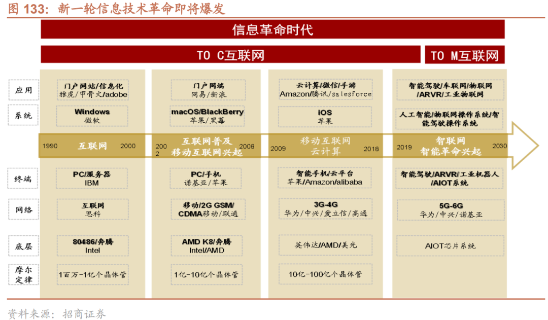 新一轮信息技术革命兴起,智联网成为下一个突破点。自1990年代以来,历经传统互联网和移动互联网两个大的时代后,To C互联网发展已经相当充分。但是,芯片技术、通信技术还在迭代发展,如果互联网的界限不再进一步开拓,信息技术革命将会面临瓶颈。而这个突破点,就是第三代互联网——to M互联网。To M互联网有两重含义:第一重,指代Machine,也就是机器互联网,在全球70亿居民几乎已经完成互联的时代,将千亿级别的机器互联,将会成为下一代互联网的核心特征。当前已经衍生出很多类似的概念,比如物联网、智能制造、智能家电、智慧城市等等。To M互联网的第二重含义,M指代“manufacturing”制造业,也就是针对制造业的互联网,也有称之为工业互联网或者产业互联网。